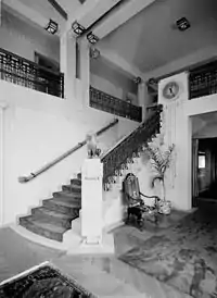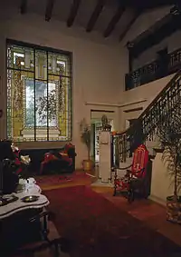 The first floor entrance hall features two expanses of stained glass. The ceiling of the hall is two stories, with oak beams lining the ceiling. The main staircase is located in the main entrance hall. The east wing of the first floor contains the living room with large marble fireplace and the conservatory. The west wing contains the kitchen, dining room, butler's pantry, parlor, and a secondary staircase.
