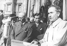 In May 1933, along with several other fugitive Communists, he managed to get to the Saarland,[1] the only part of Germany still under foreign military occupation following the end of the First World War. In July 1933 Koenen emigrated to the Soviet Union, where he would remain till 1945.[2] Initially he worked as the Organisation Secretary of the International Red Aid organisation. Then, in 1937, he was caught up in Stalin's purges and detained by the NKVD till 1939.[2] However, in 1940 he was again trusted to undertake assignments.[2] Between 1941 and 1943 he worked for the "Deutschen Volkssender" ("German People's Radio") radio station, transferring in August 1943 to Radio "Freies Deutschland" ("Free Germany").[1] He started to work for the Soviet sponsored National Committee for a Free Germany in 1943, which was also the year in which he joined the Central Committee of the (exiled) German Communist Party.[1]