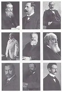 First 9 presidents of the Deutschen Gesellschaft für Orthopädische Chirurgie (l–r): Heinrich Hoeftman (1902), Albert Hoffa (1903), Ludwig Heusner (1904), Johann von Mikulicz (1905), Adolf Lorenz (1906), Bernhard Bardenheuer (1907), Wilhelm Schulthess (1908), Fritz Lange (1909), Georg Joachimsthal (1910).