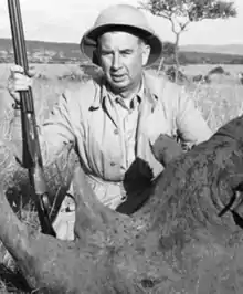 Brooks was a keen hunter and shot animals across the United States, Alaska, Canada, and Mexico.[2][4] Brooks traveled with his family to Kenya in 1947 for a hunting expedition with his wife, Virginia, and 14-year-old daughter, also called Virginia.[5] They were accompanied by two white big-game hunters and fifteen African bearers and covered a distance of 4,000 miles (6,400 km).[4] During the expedition Brooks' daughter shot a lion, cheetah, rhino and other game.[4] She killed an elephant with four shots from within 25 yards (23 m) distance and was thought to be the youngest girl to have shot an elephant dead in Kenya.[4][5] Virginia stated "I have confidence in myself. I didn't find anything to be afraid of. It was something I've always lived for" and planned to mount the animal's head and make its feet into wastebaskets.[4][5] The expedition featured as a story in Life magazine on September 29, 1947, with photographs of Brooks' daughter stood next to her kills.[4] The feature prompted Henry Fairfield Osborn Jr., president of the New York Zoological Society, to write to the magazine to lament the killing of the animals.[4] Brooks' wife did not hunt and said "Heavens, I couldn’t hit the side of a barn."[5]