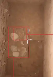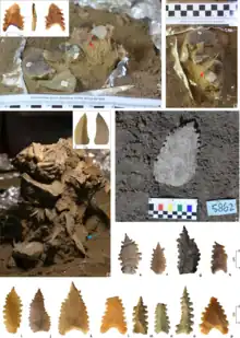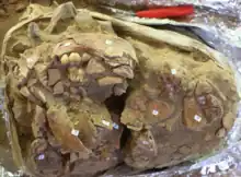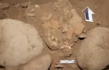 The cause of Besséʼ's death is unknown with no obvious signs of injuries or infections that leave their mark in bone.[17] Stone tools (including stone arrows known as Maros points) and red ochre were found alongside her body, indicating they were buried with her, as well as the bones of animals known to be hunted. The skull was already crushed and was recovered in fragments. Using carbon-14 dating of a galip nut seed (Canarium sp.) found in her grave, she was estimated to have died 7,300 to 7,200 years ago.[18]
