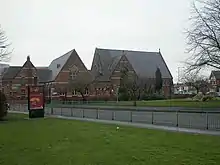 Gothic revival. A low, spreading complex, conspicuously sited at fork between Old and New Bury Roads. Red brick with bands, window heads, tympana etc in other colours. Steep slate roofs. Dated 1865 in head of gable front, which has stone plate-tracery rose window under 2 centred arch. Short transepts have similar gables. Beyond east end the associated buildings present steep gables, one to north, two to south.[1]