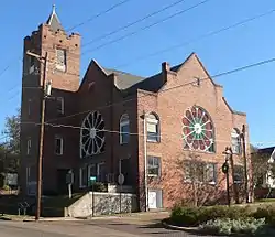 The church's congregation was established in 1864, making it the first A.M.E. church in the state. Its first church was a preexisting church building built in 1828; this was demolished to make way for the present building, which was completed in 1912. The church has a Romanesque Revival design with an auditorium plan, a common style for church buildings built in Mississippi at the time. The building features a four-story tower on the north side topped by a crenellated pyramid roof, stained glass rose windows on three sides, and a cross gabled roof with a corbelled parapet.[3]