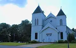 Carpenter Alex F. Simpson planned the Gothic Revival church. The one-story frame church features a square tower at both of the front corners. Each tower has a louvered lancet arch window above the first story, which is demarcated by a belt course; the towers are both topped by pyramidal spires with finials. A bargeboard with decorative moldings covers the gable between the two towers; the front entrance, added below the gable in 1958, features a matching bargeboard. The sides of the church each feature three lancet arch windows; while the windows originally had plain glass, stained glass was installed in 1981.[2]