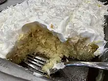 The cake's moist center is typically created by inserting a fork into the cake several times and filling the holes with a mixture containing sugar and pineapple in its juice. It is traditionally baked using a 13 by 9 by 2-inch pan and then refrigerated and eaten cold.[1][7] The cake was featured by Paula Deen on her series Paula's Home Cooking.[8][9][10]