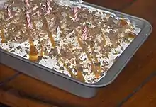 By 1990, several versions existed.[12] The basic recipe for the cake has been altered depending on the tastes of the person making the cake and alternates include chocolate, banana, or candy flavors.[13][14] A 1998 Kansas variant used chocolate cake mix, sweetened condensed milk, caramel ice cream topping, and crumbled toffee.[4] The less-explicit "better than Robert Redford" name came to be applied to both variants.[15][5][6]