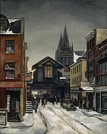 Not much has been written of her early career, but it is known that Bettersworth did some artwork for advertising in the 1920s.[4][5] She was exhibiting paintings in New York in the early 1930s[6] and lived on Christopher Street in Greenwich Village.[7] In 1933, she began the year in January with a one-woman show at the Artists Gallery in the Tower Hotel in New York City[8] and in October she exhibited portraits in an exhibition at the same venue. Though not known as a portrait painter, her works were well received.[9] In 1934, her black and white works, predominantly still lifes were shown in the Art Gallery of the Tower Hotel along with several artists from the Brooklyn Painters and Sculptors' Group.[10][11] Her work in these shows was given attention[12] and earned Bettersworth invitations to show works at the Corcoran Gallery of Art and the Museum of Modern Art.[3] Her painting Christopher Street, Greenwich Village (1934) was chosen by President Franklin D. Roosevelt to hang in the White House, when he saw it on exhibit at the Corcoran Gallery of Art.[7] By 1936, she and Howard were living in the artists' colony in Woodstock, New York, where Beulah participated in exhibits.[13][14] Betterworth was selected to complete two murals for the Section of Painting and Sculpture. White Gold in the Delta (1939) for the post office at Indianola, Mississippi, and Out of the Soil for the post office at Columbus, Mississippi, both depict cotton harvesting scenes[15] and did not shy away from depicting white foremen and black laborers.[16] Bettersworth was not the original artist commissioned to complete the work in Indianola, but when Walter Anderson was unable to complete the mural, she was selected.[17] Both at the time they were installed and at present, there have been complaints that the murals depict racist themes and should be removed.[15] The Indianola mural was destroyed[18] and though the argument over whether the Columbus mural should be removed or remain, as it accurately reflects history, is unsettled, the mural is still in place.[15] In 1947, the Betterworths sold their home in Woodstock[19] and by the early 1950s they were living in Tucson, Arizona, where Howard was working as an art director for the Cabat-Gill Advertising Agency.[20] Erni Cabat and Norval Gill, another WPA artist, had founded the agency in the late 1940s.[21] Bettersworth died in Tucson on August 3, 1968, and was buried in Tucson Memorial Park Cemetery.[22]