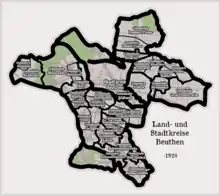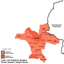 Beuthen District, or Beuthen Rural District (German: Landkreis Beuthen, Polish: Powiat ziemski Bytom) was an Upper Silesian rural district with its seat in Beuthen (Polish: Bytom), which itself was a separate district - an urban district (German: Stadtkreis Beuthen, Polish: Powiat miejski Bytom).