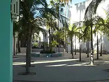 The building was designed by Charles Moore (1925-1993).[1][2][3][4] Drawing upon the Spanish Revival architecture of the city hall, Moore designed this building in a mixture of Spanish Revival, Art Deco and Post-Modern styles. It includes courtyards, colonnades, promenades, and buildings, with both open and semi-enclosed spaces, stairways and balconies.[1] It was completed in 1990.[2]