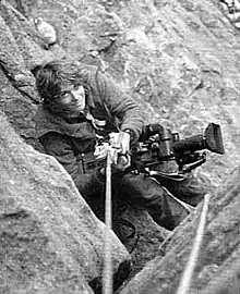 Johnson with a video camera, roped to a rockface (Mike Hoover)