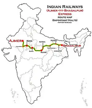 The 13423 / 13424 Bhagalpur–Ajmer Express is an Express train belonging to Eastern Railway zone that runs between Bhagalpur Junction and Ajmer Junction in India. It is currently being operated with 13423/13424 train numbers on a weekly basis.[1][2][3][4]
