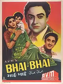 Bhai-Bhai (transl. Brothers) is a 1956 Indian Hindi-language drama film directed by M. V. Raman for A. V. M. Productions.[1][2] It had screenplay by Javar Seetharaman, with Hindi screen adaptation of the Tamil film Ratha Paasam directed by C.V. Sridhar. The music director was Madan Mohan,[3] with dialogues and lyrics written by Rajendra Krishan. One of the popular songs from the film was "Ae Dil Mujhe Bata De", sung by Geeta Dutt, "in an unabrasive fast tempo".[4] The song became one of Madan Mohan's earliest hits, and the music of the film in journalist-author Bharatan's words, went on to "conquer the box office".[1][5]