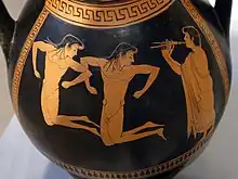 The dance consisted in kicking one's own buttocks, to music, as rapidly as possible.[7] The number of successful strokes was counted, and the most skilful received prizes in competitions. We are told by a verse from an epigram, which has been preserved by Pollux,[8] that a Laconian girl had won by dancing the Bibasis a thousand times, which was more than had ever been done before.[3][2]