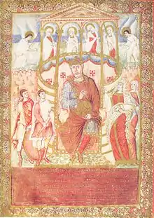 The manuscript was produced at Rheims under the patronage of Charles the Bald, and it was presented to Pope John VIII at the coronation of Charles as emperor on Christmas night, 25 December 875. The manuscript was produced between 870, the date of Charles' marriage to Richilde, and 875, the date of his coronation. During the reign of Pope Gregory VII (1073–1085), the Bible was given to the Benedictine abbey of Saint Paul Outside the Walls, where it has remained since.