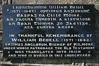 The work of translating the Old Testament was undertaken by William Bedell (1571–1642), Bishop of Kilmore, who completed his translation within the reign of Charles I.[3][4] However, the Old Testament was not published in Irish until 1685, in a revised version by Narcissus Marsh (1638–1713), Archbishop of Dublin.[5][6]