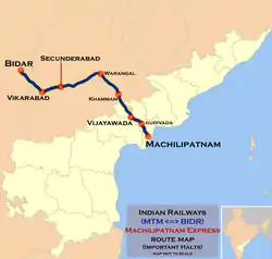 This train runs via Secunderabad, Warangal and Vijayawada. The table shows the list of stations between the two nodal stations.[4] The train was extended up to Bidar from 1 March 2018. From 2022, the route has been electrified till Bidar and operational. A WAP7 or WAP4 is used to haul this Superfast express 12749/50 from BIDAR to MACHELIPATNAM and back.