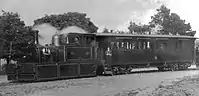 Finally the Bideford, Westward Ho! & Appledore Railway was incorporated on 21 May 1896, with its Head Office address at the Electrical Federation Offices in Kingsway, London WC2.[4] Soon after the line passed to the British Electric Traction Company (BET). It was not until 24 April 1901[5] that the single track line was opened as far as Northam, although the first trial train ran with a few friends of the directors in January 1901. The first train, pulled by Grenville was played off by Herr Groop's German Band which had been hired for the season and it reached speeds of 36 mph (58 km/h) on its inaugural run. The remaining extension to Appledore finally opened in 1908, on 1 May,[6] costing £10,000. The railway was built in three sections, with the first being from Bideford at 1 furlong, 9 chains and 50 links (0.39 km), the second from the termination of the first, being to Westward Ho!, length 4 miles (6.4 km), 3 furlongs, 9 chains and 50 links (7.23 km), and the third being from the termination of the second, to Appledore, length 2 miles (3.2 km), 3 furlongs and 4.2 chains (3.91 km).[7] The contract for construction was awarded to a Mr. Charles Shadwell of Blackburn and the estimate was for £50,000. The initial outlay was £87,208 and Mr. Shadwell was removed from his post on 13 December 1901. A subsequent court action proved that he did 'wilfully default' and judgment was given against him in 1905 for £7,500. Plans had been made for a 3 ft (0.91 m) gauge track, however as it was hoped to connect the line with the L&SWR by a bridge over the Torridge, the line was built to a Standard Gauge specification. Gradients were severe in places, with a 1 in 47 (112 ft/mi) on the Kenwith Castle to Abbotsham Road section.