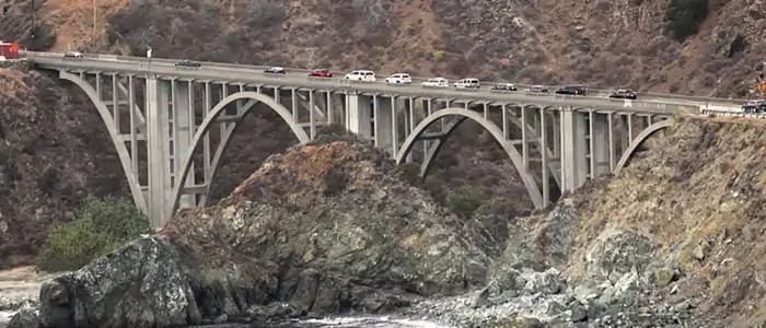 Constructed during the Great Depression and identified by Caltrans as Bridge No. 44 0056, it was opened for traffic in late 1938. Its construction was partially funded by the federal government in connection with the Works Progress Administration. Situated high above Big Creek canyon, this bridge has remained open while many others on the Pacific Coast Highway have been closed due to mud slides. There are parking areas at both ends of the bridge to allow motorists to stop and take photographs. [1]