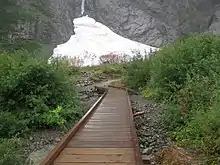 A severe autumn storm in November 2006 caused flooding of the South Fork Stillaguamish River destroying a major footbridge to the Big Four Ice Caves. Estimated repair costs to replace the damaged span were approximately $425,000, and repairs were completed in June 2009.[2] While the trail is open to the public, the snowfield itself was closed temporarily[3] due to cave-ins and slides which have killed four hikers in incidents in 1998, 2010, and in 2015.[4][5] Because of the danger, hikers are advised to stay out of the caves and are monitored by forest rangers.[6]