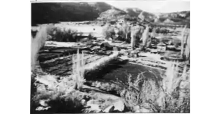 Heaton Ranch in Moccasin, AZ, at the base of the Vermilion Cliffs, in winter. The photo shows the Big House (upper center right, in grove of trees), the schoolhouse dating 1904 (across the road from the Big House and nearer the camera than the Big House; white with a dark roof), and a residence occupied by Charles and Margaret Heaton, Jonathan and Lucy Heaton's eldest son and his wife (multistory residence to the center right of the photo; white with a dark roof), as well as several outbuildings. Moccasin Spring is in the open area to the upper left. (Photo ca. 1906)