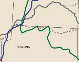 Old Spanish Trail early exploration routes in southern Utah and northern Arizona. Green=Dominguez-Escalante, 1776–1777. Blue=Jedediah Smith, 1826–1827. Double-Dashed=Armijo Route, 1829. Brown=Northern Route, 1831. Dashed=North Branch, 1848.