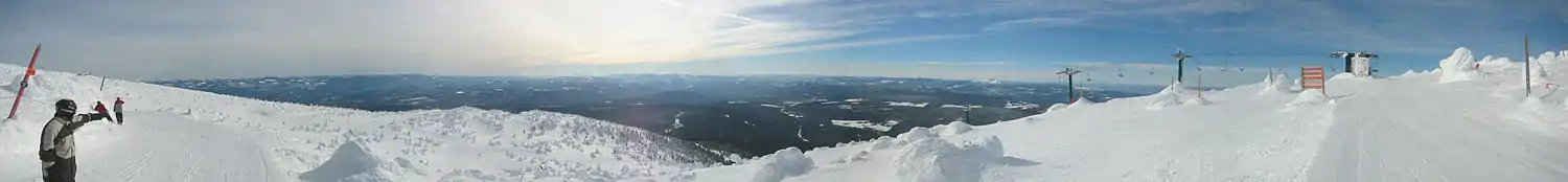 Big White Ski Resort, simply known as Big White, is a ski resort located 56 km (35 mi) southeast of Kelowna in the Southern Interior of British Columbia. It is located on Big White Mountain, the highest summit in the Okanagan Highland, an upland area between the Monashee Mountains and the Okanagan Valley. Big White is the fourth largest resort in British Columbia, after Whistler-Blackcomb, Sun Peaks, and Silver Star. In 2019, Big White was nominated as the third-best ski resort in Canada by Snowpak.