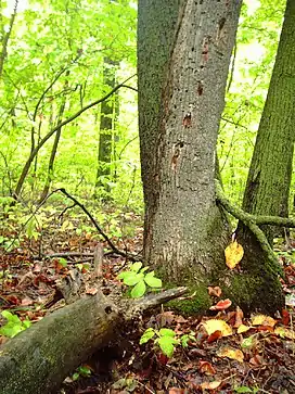The soil of the Big Woods is thick glacial till of crushed limestone, deposited by the Des Moines lobe of the Wisconsin glaciation 10,000 years ago.[2] The landscape is characterized by round hills and numerous undrained lakes left by melting ice blocks. These hills and lakes suppressed fires that were instrumental forces on the prairie to the west and the oak savanna to the south and east. The Minnesota and Crow Rivers flow through the region, but many of the 100 or so lakes had no inlets or outlets.