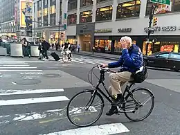 He cultivated his own fashion signature, dressing in a uniform of black sneakers and a blue moleskin workman's jacket, his only accessory a camera. He traveled Manhattan by bicycle, repeatedly replacing those that were stolen or damaged in accidents. He praised the city's bike-sharing program when it launched in 2013: "There are bikes everywhere and it's perfect for the New Yorkers who have always been totally impatient. What I love, is to see them all on wheels, on their way to work in the morning in their business suits, the women in their office clothes ... It has a very humorous and a very practical effect for New Yorkers ... I mean, it's wonderful."[58] After breaking a kneecap in a biking accident in 2015, he wore a cast and used a cane to photograph a Mostly Mozart Festival gala.[59]