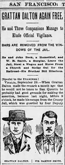 On September 21, Grat Dalton was brought into court to face sentencing, but this was instead postponed to October 6. This was a date that Grat had no intention on making. Rumors had circulated for months that Bob had planned to come and liberate Grat, so two of sheriff Kay's deputies, Jim Wagy and Bob Hockett, had been hired by Wells Fargo to guard Grat's cell until he was sentenced and sent to San Quentin. This was in addition to the jailer, J.M. Williams. One night, Jim Wagy heard a noise in the basement and upon investigation discovered that someone had tried to break the lock to the grated window. He decided to watch the outside of the place at night to see if he could catch in the act whoever was trying to open the grating. Wagy hid all night in a yard across the street but saw nothing. Instead he caught a cold from sitting in the fog all night. The next morning, Grat called Wagy over to his cell and asked him where he got such a cold. Wagy told him that he must've slept in a draft, to which Grat replied, "Yes, it must have been pretty cold in the yard over there last night." Grat could not see the yard Wagy had laid in from his cell and the deputy hadn't told anyone what he had done that night. Expecting there to be an escape, and because none of the other deputies would listen to him, Wagy decided to quit.