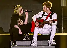 She has recounted that Matty Healy was an early inspiration for her: "His show is the second show I ever went to in my life. He changed so much about who I am, how I write music."[190][195] She has also cited Tyler, the Creator, Childish Gambino, and Avril Lavigne as major musical and style influences.[196][197] Other influences include Adele,[198] Earl Sweatshirt, James Blake, Amy Winehouse, the Spice Girls, Lorde, Marina and the Diamonds, Britney Spears, Taylor Swift, Nicki Minaj, XXXTentacion, and Twenty One Pilots.[207] She has also shown appreciation for Paramore after inviting Hayley Williams to join her set during Williams's first Coachella set to perform an acoustic version of "Misery Business" and sing "Happier Than Ever".[208] Eilish also named Rihanna as an inspiration for her style choices after she called fashion her "defense mechanism" during an acceptance speech.[209] She has also credited Damon Albarn for changing the way she views art and music creation.[210]