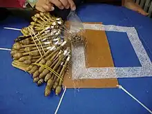 Tradition says that Binche lace was started in the 15th century by lacemakers that moved to Binche from Ghent with Mary of Burgundy, however there is no proof for this legend.[2] However, Binche lace was being made by the end of the 16th century. In 1585, when the river Scheldt was closed to shipping, Binche did not suffer a decline in its lacemaking as did others up the river such as Antwerp lace. Binche lace was the subject of a royal edict in 1686, which implies that the lace must have been fairly important.[3]:121–122 The heyday of Binche lace was in the 18th century, when it was popular in Parisian circles.[3]:121–122 It began to die out at the end of the 18th century, and was not made much during or after the 19th century. In 1862 Victor Hugo mentioned Binche lace as the material of Cosette's wedding gown in Les Misérables, as he remembered it from his youth as being a lace of great beauty.[3]:121–122 The quality of Binche lace declined at the end of the 18th century, with the lace becoming coarser and the patterns less detailed.[2] Originally Binche lace resembled Valenciennes lace.[4]