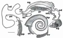 The specific characteristics of the reproductive system of Biomphalaria tenagophila are: more than 200 diverticulae of the ovotestis; 7–11 main lobes of the prostate; and presence of vaginal pouch.[10]