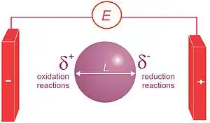 Bipolar electrochemistry is a phenomenon in electrochemistry based on the polarization of conducting objects in electric fields. Indeed, this polarization generates a potential difference between the two extremities of the substrate that is equal to the electric field value multiplied by the size of the object. If this potential difference is important enough, then redox reactions can be generated at the extremities of the object, oxidations will occur at one extremity coupled simultaneously to reductions at the other extremity.[1][2] In a simple experimental setup consisting of a platinum wire in a weighing boat containing a pH indicator solution, a 30 V voltage across two electrodes will cause water reduction at one end of the wire (the cathode) and a pH increase (OH− formation) and water oxidation at the anodic end and a pH decrease. The poles of the bipolar electrode also align themselves with the applied electric field.[3]