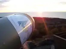 Birdwatching in sunrise, a spotting scope with a stcker from the Swedish Ornithological Society.