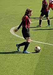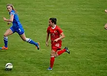Birgül Sadıkoğlu in the Turkey women's national under-17 football team (red) driving the ball at 2015 UEFA Women's Under-17 Championship qualification Elite round match against Finland.
