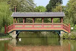 The park contains many listed buildings. The Grand Entrance was designed by Lewis Hornblower and is at the northeast corner; it consists of three arches flanked by lodges and is in Ionic style. The Swiss Bridge, a pedestrian span of stringer construction, is unique as being the only covered bridge of traditional wooden construction in the United Kingdom. There is also a Pavilion called the Roman Boathouse standing by the lake in the park, the upper storey of which was originally intended to be a bandstand. There are many historic listed lodges of various designs within the grounds of the park.