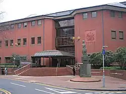 The new building was designed by Property Services Agency, built in red brick with terracotta dressings at a cost of £8.9 million,[4] and was completed in 1987.[5] The design involved an asymmetrical main frontage facing onto Dalton Street. The central section, which was projected forward, featured a full-height glass atrium to the right of centre. A carved terracotta Royal coat of arms was installed on the first floor to the right of the atrium. Short canted sections connected the central section to the wings. The whole structure was fenestrated by small square windows with architraves. Internally, the building was laid out to accommodate twelve courtrooms.[6]