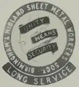 The union's origins lay in the Birmingham Tin Plate Workers' Society, which was formed in 1859.[2] In 1876, it merged with the Wolverhampton Tin Plate Workers' Society to form what later became the National Amalgamated Association of Tin Plate Workers. The societies retained much of their independence, particularly in the early years.[3] In 1906, the society renamed itself as the Birmingham Operative Tin-Plate, Sheet Metal Workers and Braziers' Society.[4]