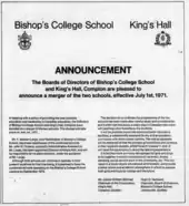King's Hall Compton, or KHC, its sister school, was founded in 1874 where heads of BCS such as James Williams (bishop) acted as the first chairman. In 1972, the two institutions merged making it one of the first co-ed independent schools in Canada. In 1995, Nancy Layton was appointed as Head of School, which made BCS the first co-ed independent school with a female headmaster in Canada.[24] The School's former faculty was also responsible for the founding of Trinity College School in Port Hope, Ontario in 1865, and Ashbury College as an affiliated institute in 1891 to accommodate BCS Ottawa-based students. BCS raised six Canadian independent schools in total, making it once known as the "school of the headmasters" during the early 20th century.[25][26]
