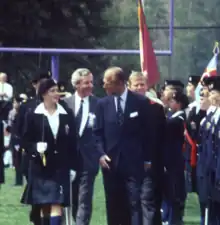 In 1901, the cadet corps took part in the Guard of Honour during the visit of Duke (later King George V) and Duchess of York to Sherbrooke. The Cader Corps was also inspected by the Duke of Devonshire, King Edward VIII in 1919, King George VI in 1939 and Queen Elizabeth The Queen Mother in 1962.[19] In May 1989, the school's annual cadet inspection was inspected by The Duke of Edinburgh with a crowd of two thousand people.[20] The Duke also granted the school's new coats of arms registered under the Royal Heraldry Society of Canada.[22]