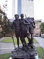 Statue in Brisbane, Australia of Raphael Aimbari, an Oro man, leading a blinded Australian soldier during the New Guinea Campaign