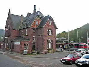 The building is particularly distinguished by its red sandstone squares and lies between the railway tracks and Mainzer Straße. Build in red sandstone in the Gothic Revival style, similar to other entrance buildings on the Eifel Railway, it makes reference to the landscape and the regional history. The ticket hall, which ends with shield gables, juts out at right angles on both longitudinal sides. The gables are additionally emphasised by pointed arches. The part of the building that adjoins to the south of the ticket hall is accentuated by a projecting bay-like dwarf gable structure. The gabled structures of the north side as well as their embellishments are designed as a work of art.[7] These splendid "palaces" (Schlösser) were financed from the money that France had to pay as reparations to Germany after the Franco-Prussian War.[5]