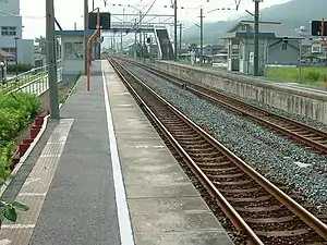 The station consists of two opposed ground-level side platforms connected by a footbridge. The station is unattended.