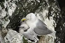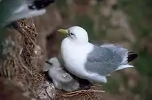 Chicks usually hatched through the larger end of the egg using their egg tooth.[17][21] The egg tooth usually disappear after seven days post-hatching.[21] The alpha and beta chicks tend to hatch 1.3 days apart.[17] Kittiwake are born semi-precocial. The downy young of kittiwakes are white, since they have no need of camouflage from predators, and do not wander from the nest like Larus gulls for obvious safety reasons. Regardless of predation, the chicks are most vulnerable within their first week due to their incapacity to properly thermoregulate during that period.[17][21] Kittiwake chicks also exhibit siblicide, meaning that the first-born chick may kill its sibling in order to avoid competition for food from their parents.[21] If siblicide is to occur, it will most likely occur within the first 10 days of life of the smaller chick, in most cases the last born.