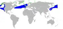 The black-legged kittiwake is a coastal bird of the arctic to subarctic regions of the world.[5] It can be found all across the northern coasts of the Atlantic, from Canada to Greenland as well as on the Pacific side from Alaska to the coast of Siberia.[6] Black-legged kittiwakes' wintering range extends further south from the St-Lawrence to the southern coast of New Jersey as well as in China, the Sargasso sea and off the coast of west Africa.[6][7] There are two subspecies of black-legged kittiwake. Rissa tridactyla tridactyla can be found on the Atlantic coast whereas Rissa tridactyla pollicaris is found on the Pacific coast.