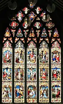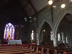 The nave leads to the altar below the tower. Immediately behind the altar is the large stained glass window known as the "Rosary Window", which is composed of five "lights" or great vertical panels, and is the largest stained glass window in Ireland.[2] This window was created in 1892 by Mayers of Munich, and depicts the Mysteries of the Rosary.[4]
