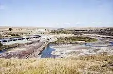 The Missouri River drops a total of 612 feet (187 m) from the first of the falls to the last, which includes a combined 187 feet (57 m) of vertical plunges and 425 feet (130 m) of riverbed descent.[3] The Great Falls have been described as "spectacular",[4] one of the "scenic wonders of America",[5] and "a major geographic discovery".[6] When the Lewis and Clark Expedition became the first white men to see the falls in 1805, Meriwether Lewis said they were the grandest sight he had beheld thus far in the journey.[7]