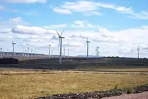 ![]() Black Law Wind Farm with the Pentland Hills in the background | |