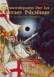 Volume 1, Le signe des Ténèbres (Sign of Darkness), showing the armies of the Order of Light, led by Fratus Sinister, under the Black Moon (which appears on all album covers)
