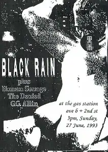 Black Rain is a live EP of Black Rain, released in November 15, 1993 by TPOS. The set was performed during a supporting performance for punk rock band GG Allin & The Murder Junkies, which also happened to be Allins final show before dying of a drug overdose later in the night.[1]